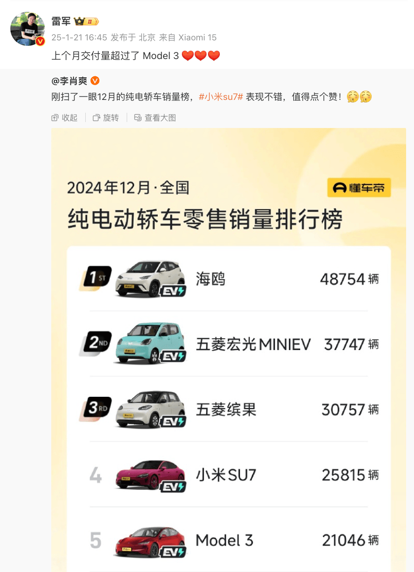 这一数据不仅彰显了小米在汽车边界的强劲势头,也进一步谨慎了其在新能源汽车市集的地位。据雷军暴露,小米SU7在上个月(即2024年12月)的录用量以致卓著了特斯拉的Model 3,这一得益无疑为小米汽车将来的发展奠定了坚实的基础。