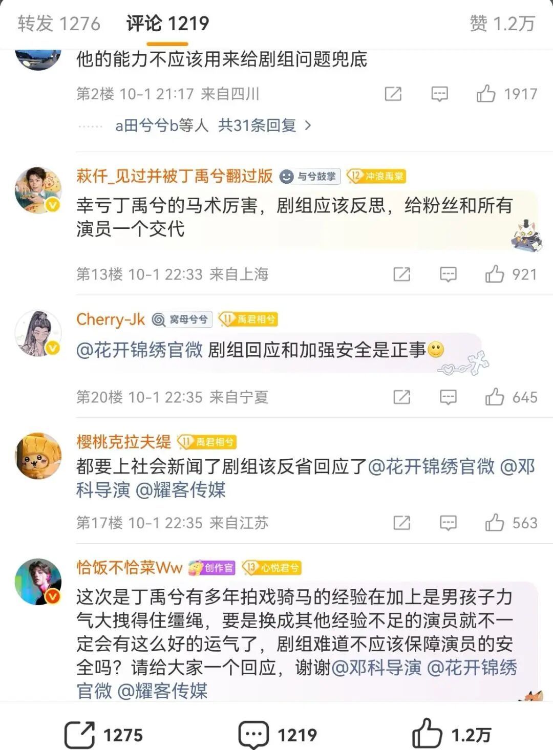 不外,也有网友质疑,所幸丁禹兮有一定骑马教化,才能临危不乱实时控马。但他的能力不应该用来给剧组问题兜底。驯养不到位的马匹参与拍摄责任,现场刺激源未收尾到位,事故发生后也莫得专科东说念主员介入处理……以上种种问题重复怎样能不令东说念主操心,请剧组喜爱这一系列问题,制定愈加完善的驻扎步调,恒久作念到把演员的安全问题放在第一位。