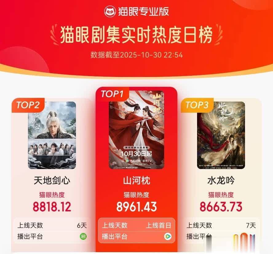 此次排行洗牌,可谓是“新旧友替”,精彩纷呈。《江山枕》凭借坚强的演员声势和吸睛的剧情设定首顺服利;《宇宙剑心》和《水龙吟》依靠顶流IP和主演魔力稳居前哨;