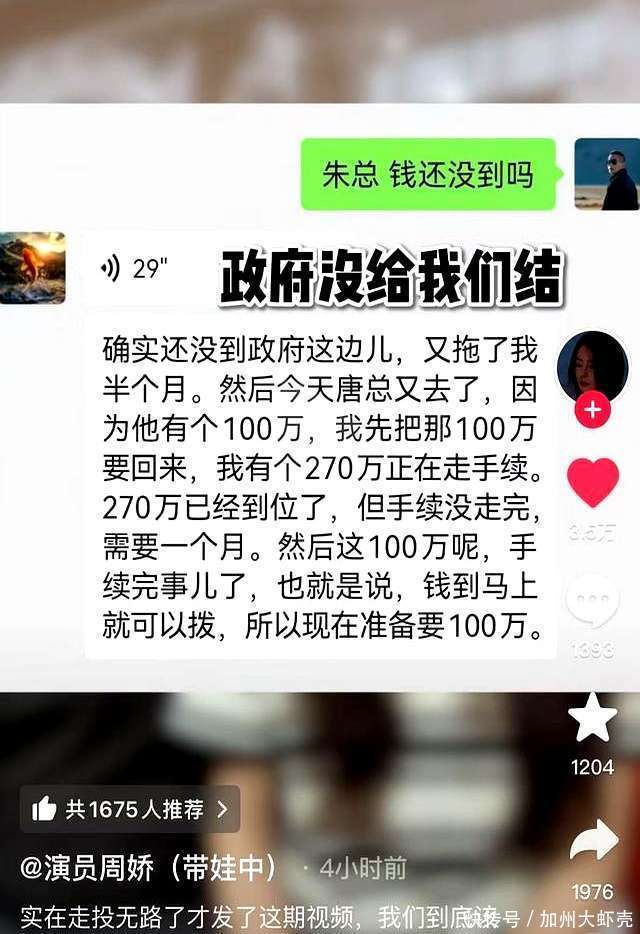 视频里,周娇的老公陶建冰也挺无奈,说每次催款,对方齐找各式意义粗鲁,“政府没给我们结,财务出了问题,等等等等。” 听着就让东说念主窝火。