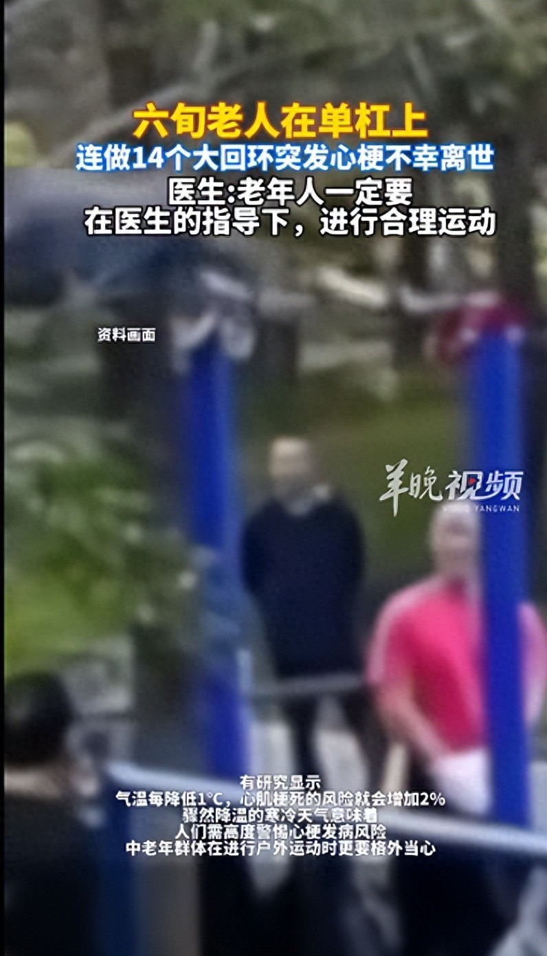 近日,北京,一位60多岁的老东谈主用绳索固定在单杠上作念大回文畅通,不迢遥的监控探头显露,老东谈主在完成了14个大回文当作后突发心梗,扭捏了两下体格便失去了意志,最终老东谈主因病情过重未能抢救过来。