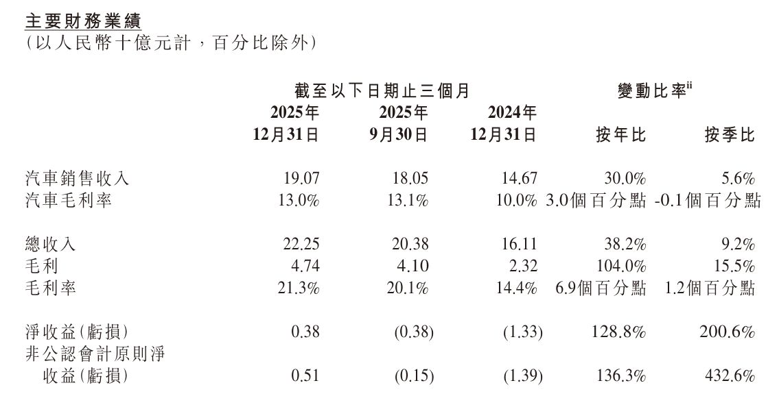 3月20日,小鹏汽车(09868.HK, XPEV.US)发布2025年全年录取四季度财务事迹陈诉。数据自满,2025年,小鹏汽车总营收达767.2亿元,同比增长87.7%。其中,2025年第四季度营收达222.5亿元,创历史新高,同比增长38.2%,且第四季度净利润超过3.8亿元,已矣公司拓荒以来初度单季度盈利。不外,净利润方面,小鹏汽车2025年仍处于亏空景况,全年亏空11.4亿元。