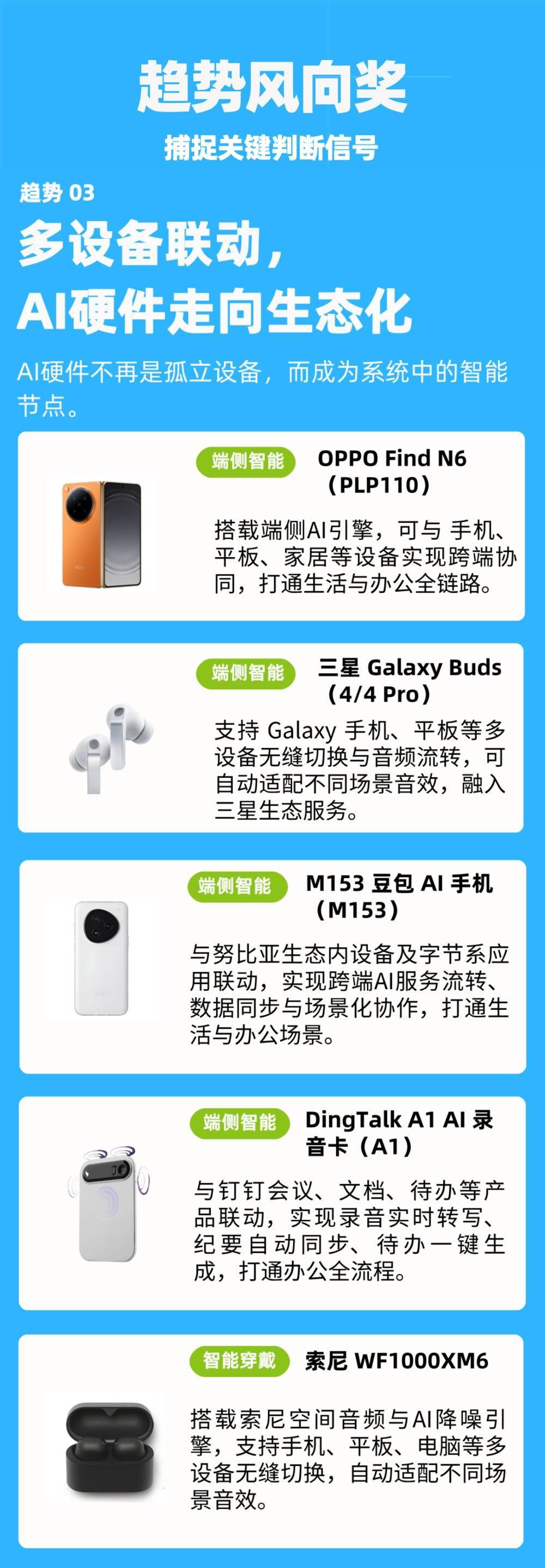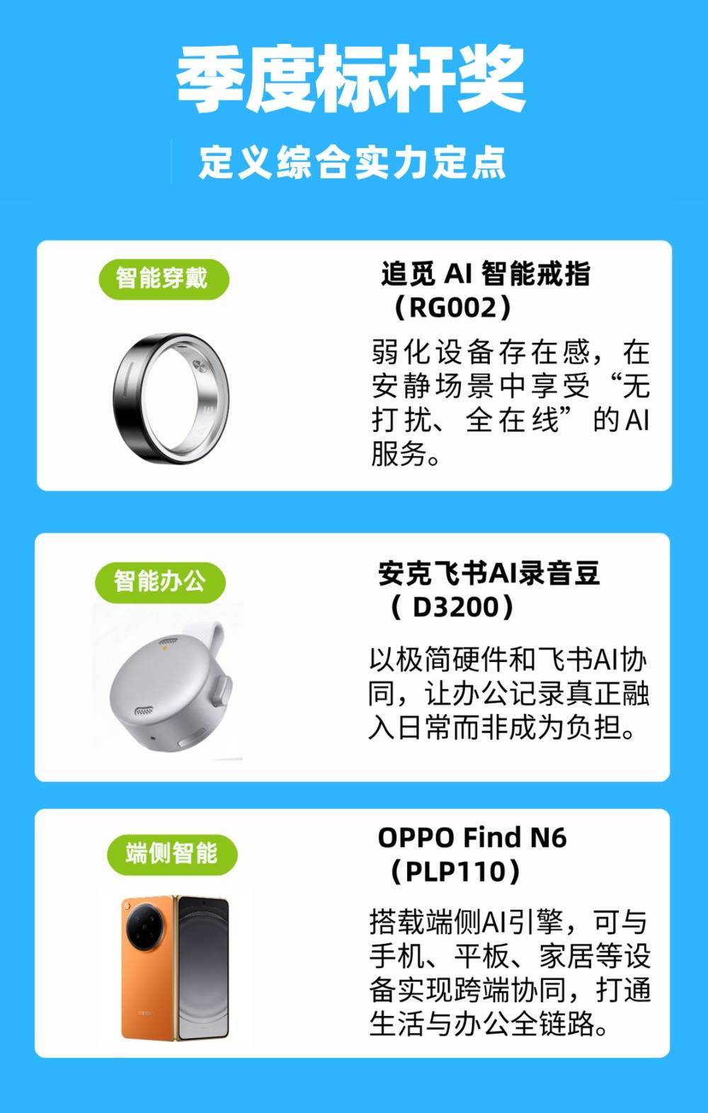 趋势风向奖告诉咱们“该看什么标的”,而季度标杆奖则讲演“这个标的里谁最强”。本季AI硬件的标杆居品,一次看全。